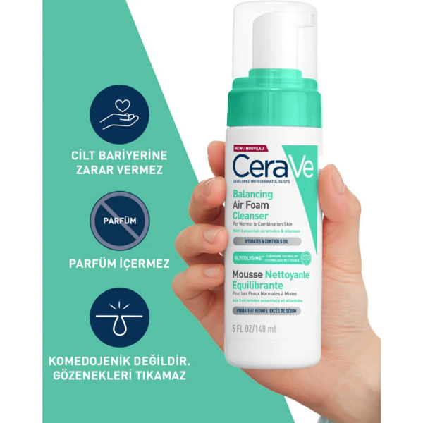 CeraVe Airfoam Temizleyici Köpük, normalden karmaya dönük ciltler için özel olarak geliştirilen dermatolojik yüz temizleyicisidir.