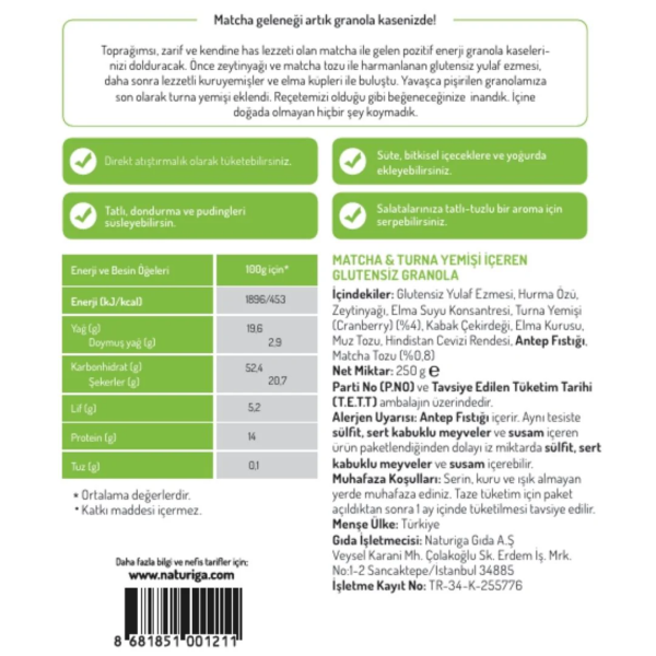 Naturiga Glutensiz Matcha & Cranberry Granola 250 g, özenle seçilmiş bitkisel içeriklerle hazırlanan, glutensiz beslenmeyi tercih edenler için ideal bir granola alternatifidir. Matcha çayının kendine özgü aroması ile cranberry meyvesinin hafif ekşi ve tatlı dengesi bir araya gelerek keyifli bir lezzet profili sunar.