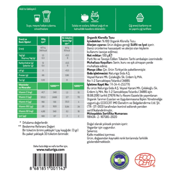 Organik tarım standartlarına uygun olarak üretilen klorella, katkı maddesi içermeyen yapısıyla doğal beslenmeyi tercih eden kullanıcılar için uygundur. Kendine özgü yeşil rengi ve bitkisel aromasıyla smoothie, içecek ve tariflerde rahatlıkla kullanılabilir.
