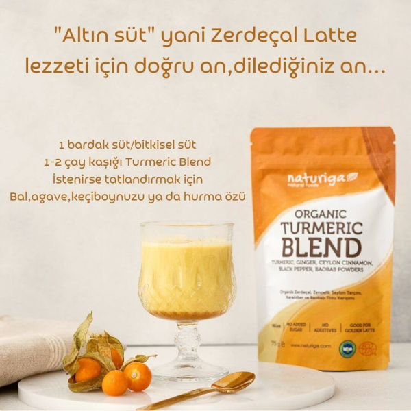 Yoğun baharat tadını yumuşak bir içimle birleştiren altın süt karışımı, sıcak içeceklerden tariflere kadar farklı kullanım alanlarına uygundur. Katkı maddesi içermeyen yapısı ve organik sertifikalı hammaddeleri ile sade ve doğal içerik tercih edenler için ideal bir seçenektir.