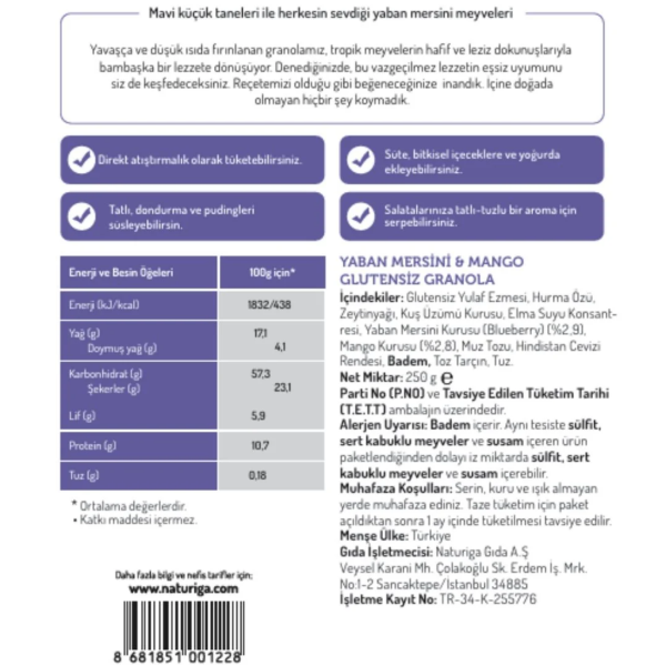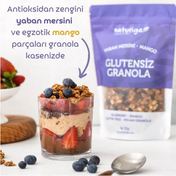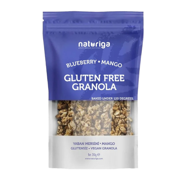 Naturiga Glutensiz Yaban Mersini & Mango Granola, özenle seçilmiş glutensiz içeriklerin meyve aromalarıyla dengeli şekilde harmanlanmasıyla hazırlanmıştır. Yaban mersini ve mango parçalarının doğal lezzeti, granolanın çıtır dokusuyla birleşerek kahvaltıdan ara öğünlere kadar keyifle tüketilebilecek pratik bir seçenek sunar.