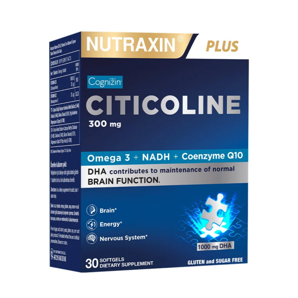 Nutraxin Citicoline 300 mg 30 Softgel, özenle formüle edilmiş takviye edici gıda ürünüdür. İçeriğinde Citicoline, Omega-3 (DHA & EPA), Koenzim Q10, B6 ve B12 gibi bileşenleri bir arada sunar. Yumuşak jel kapsül formuyla günlük kullanım için pratik bir seçenek sağlar. Sitikolin, hücresel yapıda yer alan bir bileşen olarak dikkat çekerken; Omega-3 yağ asitleri EPA ve DHA temel yağ asitlerini içerir. Ayrıca formülasyon B6 ve B12 vitaminlerini de kapsayacak şekilde zenginleştirilmiştir.