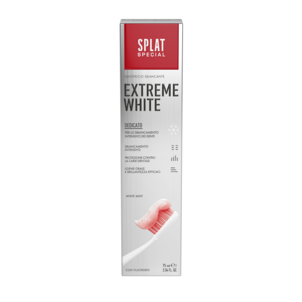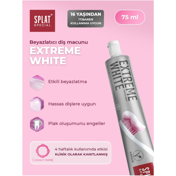 75 ml tüp formundaki ambalajı ile pratik kullanım sunan Splat Special Extreme White Diş Macunu, hem evde hem de seyahatlerde kolaylıkla kullanılabilir.