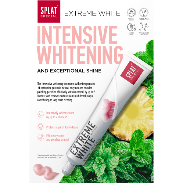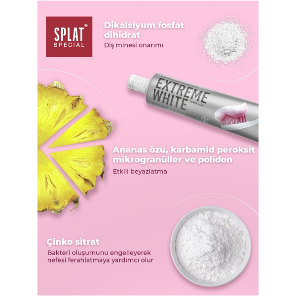 Splat Special Extreme White Diş Macunu, diş yüzeyinde zamanla oluşan lekelerin giderilmesine yardımcı olan özel formülü ile günlük ağız bakım rutininizi desteklemek için geliştirilmiştir. Yoğun beyazlatma etkisine odaklanan formülü sayesinde düzenli kullanımda dişlerin daha parlak ve temiz görünmesine katkı sağlar.