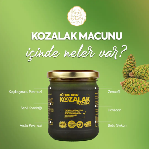 İçindekiler: Kozalak, Günlük, Sakız (Çam), Zerdeçal, Zencefil, Havlıcan, Karanfil, Kebabiye, Beta glukan, Çinko glukonat, Kolekalsiferol (Vitamin D3), Askorbik Asit (Vitamin C), Keçiboynuzu Tozu, Andız Pekmezi, Keçiboynuzu Pekmezi, Nane.
